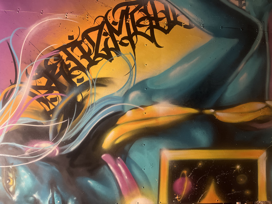 A vibrant mural showcases a teal figure with flowing lines and golden accents