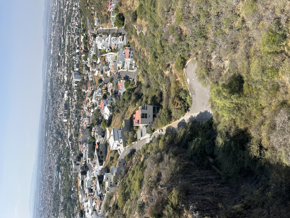 An aerial view shows a city sprawling to the left and a hillside on the right. The hillside is covered with lush vegetation, including trees and shrubs, with a winding paved road snaking through the greenery. Several houses dot the landscape, especially closer to the city, where dense residential development is visible. The city fades into a distant horizon under a light blue sky.