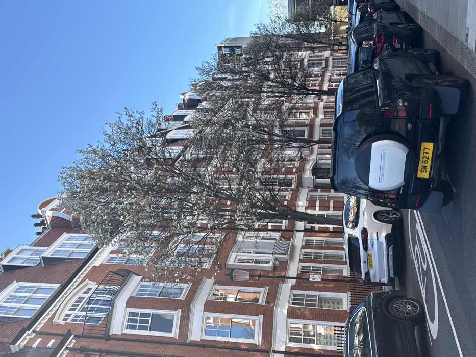 The image depicts a street scene in a residential area of London, United Kingdom, under a clear blue sky. A row of multi-story, red-brick terraced buildings lines the left side of the street, featuring distinctive white-framed sash windows, some with curved or angled bay window projections, and ornate wrought-iron balconies. The buildings are topped with mansard roofs containing white-framed dormer windows. Deciduous trees, predominantly in full white blossom, are planted along the pavement between the buildings and the street. In the foreground, a black, new-generation Land Rover Defender SUV is parked, facing away from the viewer. Its rear-mounted spare wheel has a white cover, and a yellow Northern Ireland license plate "SW 6277" is visible. To its left, a white BMW X5 SUV is parked, displaying a yellow UK private/cherished license plate "L973 CJE." Further left, the partial rear of a dark-colored SUV, possibly a Porsche Cayenne, is visible. Multiple other vehicles are parked further down the street on the right. The asphalt road features white line markings, including a double white line separating lanes. A black, ornate Victorian-style streetlamp with attached parking signs stands on the left pavement. No people are visible in the scene. The presence of trees in blossom suggests the season is spring. The architectural style and vehicle types indicate an affluent area within London, consistent with boroughs like Kensington or Chelsea.