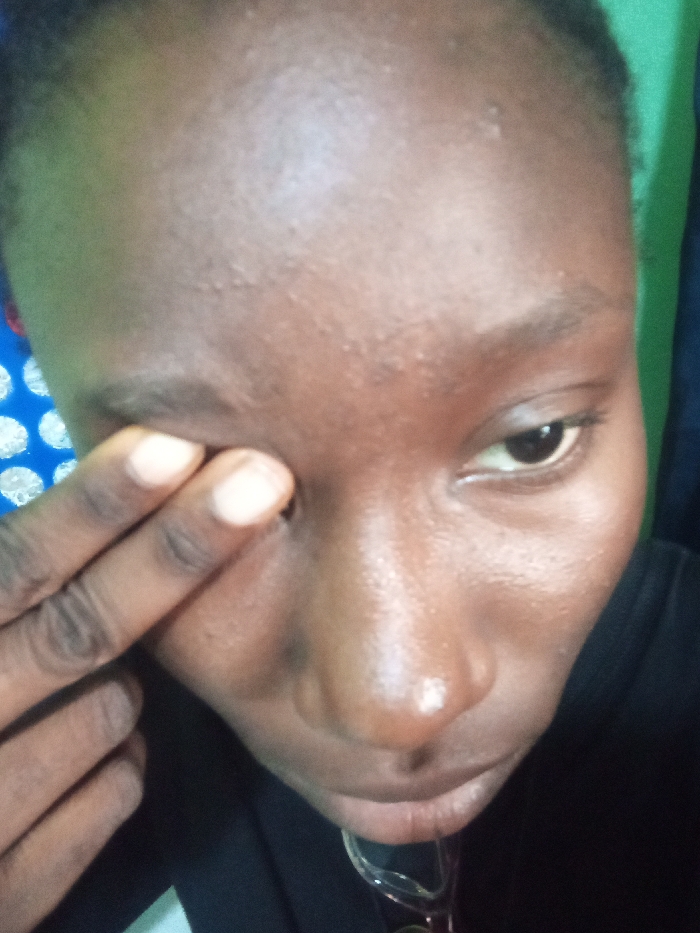 A close-up image features a single individual, located in Narayi, Nigeria. The subject exhibits dark skin and short, dark hair. The left hand is positioned over the left eye, with the thumb, index, and middle fingers visible. The right eye is open, directing its gaze towards the right. Skin texture is visible across the forehead and cheeks, and a slight sheen is present on the facial skin, particularly the forehead and nose. The subject wears a dark garment, partially visible around the neck and shoulder. A pair of spectacles, with clear lenses and dark frames, hangs below the chin. The blurred background displays a blue surface with white circular patterns on the left and a solid green vertical surface on the right, indicating an indoor setting.
