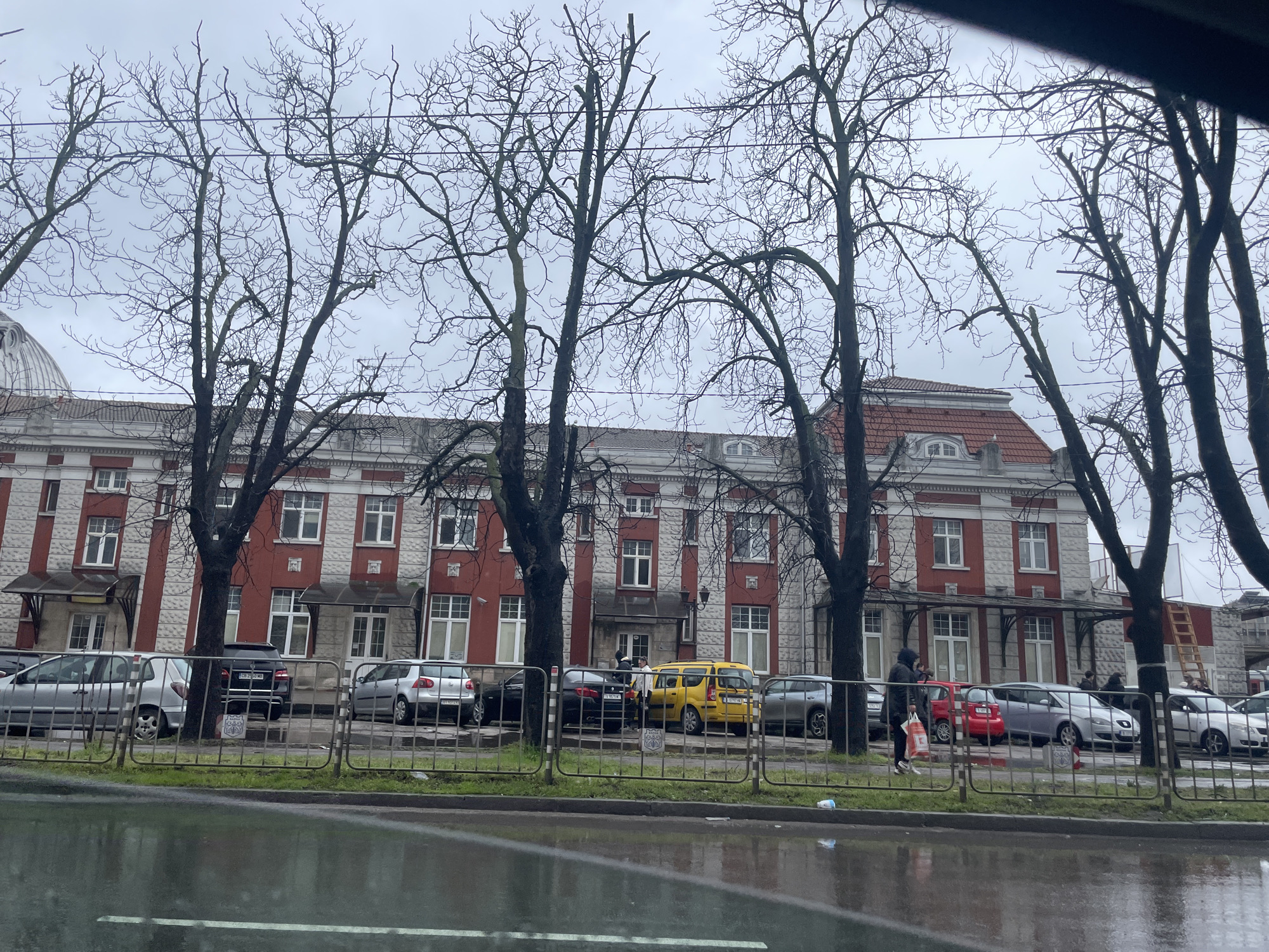 The image depicts a street scene in Varna, Bulgaria on an overcast day, likely after rain, as evidenced by the wet pavement. In the background is a red and white building with multiple windows and a red roof, partially obscured by several leafless trees. A metal fence runs along the street, separating the sidewalk from the road. Various cars are parked along the building's side of the street, including a yellow van. A person in dark clothing is walking along the sidewalk, carrying a shopping bag. A ladder is visible near the right side of the building, suggesting potential construction or maintenance work. The overall atmosphere is urban and somewhat gloomy due to the weather conditions and bare trees.