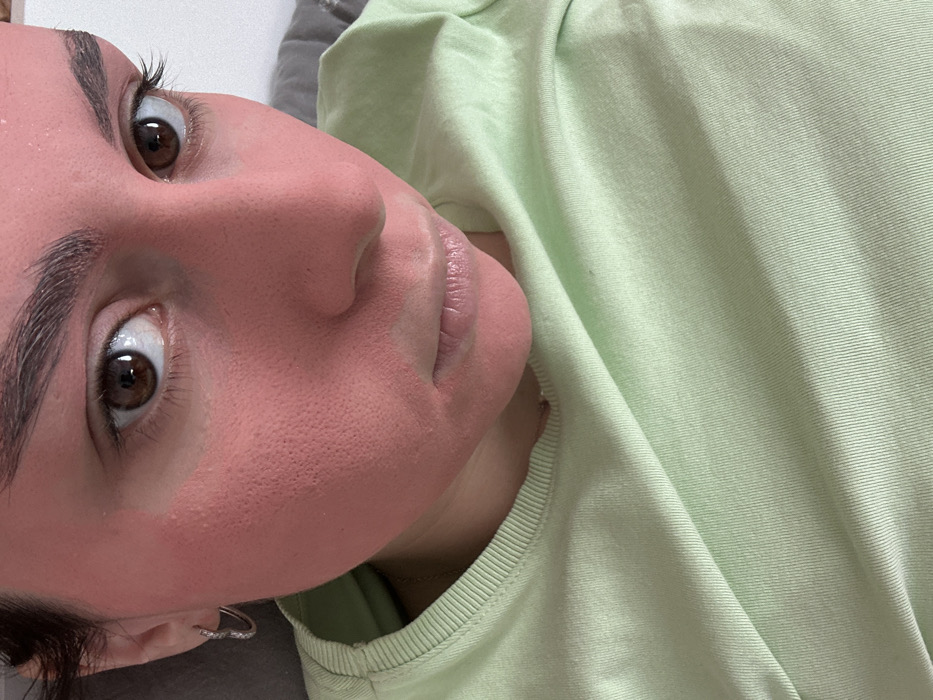An individual is depicted in a close-up portrait within an indoor setting in the city of Trudovaya, Russia. The subject's face is largely covered by a solid, reddish-pink, matte substance, consistent with a cosmetic application such as a face mask. Patches of natural skin tone are visible around the inner and lower areas of both eyes. The substance exhibits a slightly textured, porous appearance. The subject's eyes are open, with visible brown irises, and dark, prominent eyebrows are uncovered. A small, silver-colored, hoop-style earring is visible on the subject's left earlobe. The lips are also coated with the pink substance, but their natural striations are still discernible. The individual wears a light green, long-sleeved garment with a ribbed crew neck. The background is out of focus, revealing a blurred, light-toned, possibly grey and white patterned textile, indicating an indoor environment. The subject maintains a direct gaze towards the camera.