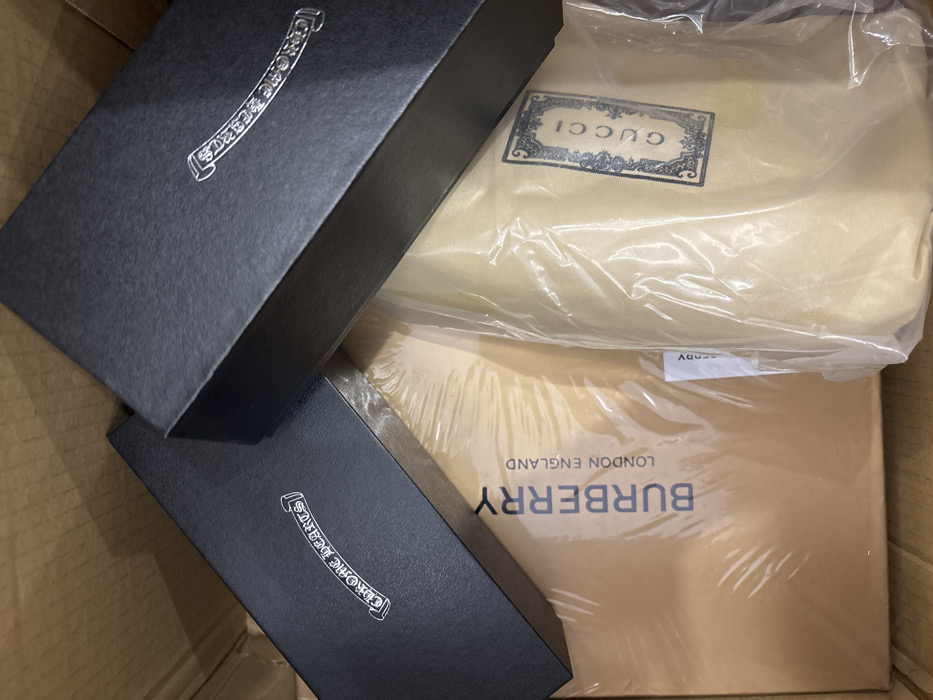 The scene depicts multiple packaged luxury brand items contained within an open corrugated cardboard box. Two matte black boxes, each bearing the silver "CHROME HEARTS" logo, are visible in the upper portion of the frame. Below them, a light brown package, wrapped in clear plastic, displays the "BURBERRY LONDON ENGLAND" logo. To its right, a cream-colored dust bag, also encased in clear plastic, reveals a framed "GUCCI" logo. The interior walls of the cardboard box are visible, suggesting the items are either packed for shipment or unpacked. There are no people, explicit actions, or interactions depicted. The specific location in Sofia, Bulgaria, cannot be determined from the provided image.