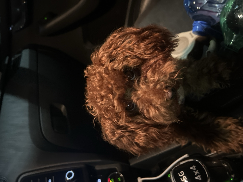 - "A reddish-brown, curly-haired dog, consistent with a poodle breed, is centrally positioned within the interior of a vehicle in Plovdiv, Bulgaria" by FM-hU2Hi1, licensed under CC BY 4.0