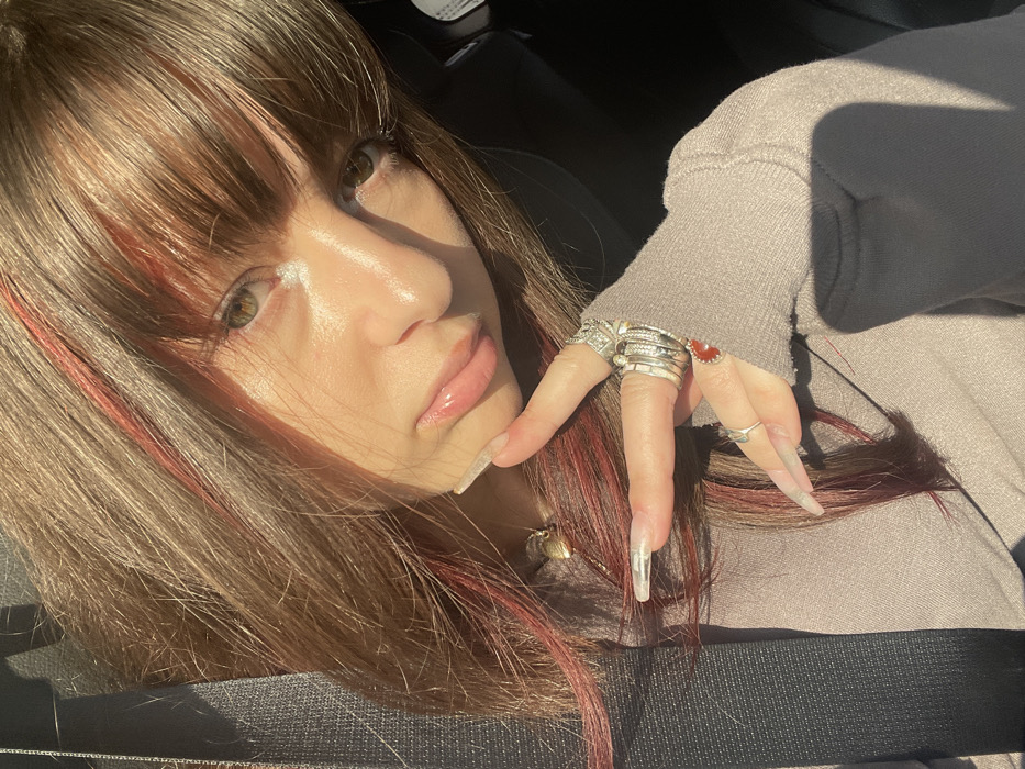 A close-up, high-angle portrait captures an individual seated in the interior of a vehicle, in the city of Hod HaSharon, Israel. The subject, appearing female, has long brown hair featuring reddish-pink streaks and bangs. Direct, strong sunlight from the upper left illuminates the face, creating pronounced highlights on the forehead and nose, and casting shadows. The subject's face displays brown/hazel eyes and glossy, slightly pouting lips. A gold-colored heart-shaped pendant is visible on a necklace. The individual wears a light brown or taupe long-sleeved garment. The right hand is positioned near the chin and mouth, showcasing long, clear artificial nails. Multiple silver-toned rings adorn the fingers of the right hand, including stacked rings on the middle and ring fingers, and a prominent red-stoned ring on the pinky finger. A black seatbelt is visible across the subject's left shoulder, contrasting with the dark, indistinct vehicle interior in the background.