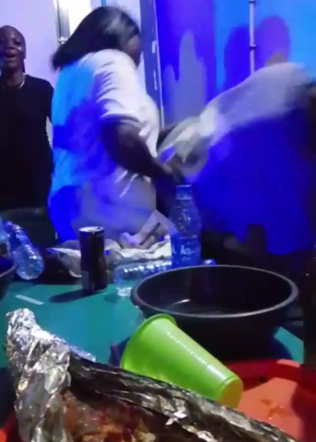 group of people in a room with colored lighting, gathered around a green table covered with food, drinks, and disposable tableware. A woman in a white t-shirt and jeans is standing near the table, seemingly interacting with another person. The camera is hand-held and moves around, capturing different parts of the scene, including the food on the table, which appears to be wrapped in aluminum foil. There are also plastic bottles of water, a can of soda, a black bowl, and a green plastic cup on the table. The room has a modern feel with a door visible in the background. The lighting changes from blue to pink and purple, suggesting a party or social gathering.