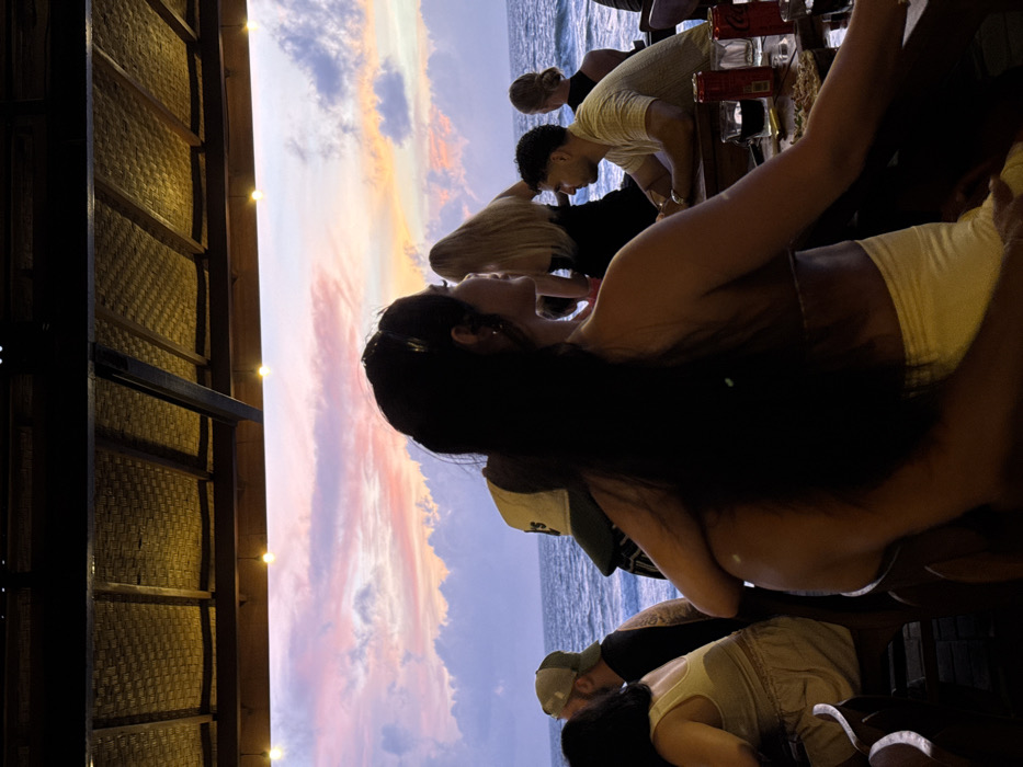 The image depicts a crowded, open-air beachfront establishment in Canggu, Indonesia, during sunset. The sky above the ocean exhibits vibrant pink, orange, and purple hues, with scattered white and grey clouds. The deep blue ocean, featuring visible waves and whitecaps, stretches across the horizon. The venue features a light-brown, woven or thatched ceiling supported by dark wooden beams, from which several bare-bulb string lights are suspended, casting a warm glow. In the foreground, a person with long, dark hair, wearing a light-colored strapless top and matching bottom, faces away from the camera, looking towards the ocean. An arm, presumably belonging to another individual seated or standing behind them, is wrapped around their waist. To the immediate left, a person with dark hair, clad in a light tank top and shorts, is seated at a dark wooden table, also facing the ocean. Beside them, a male wearing a light-colored baseball cap and a dark t-shirt is partially visible. In the midground-right, a blonde-haired person in a dark top stands or leans, facing the ocean. To their right, a male with short dark hair and a light-colored patterned shirt is seated at a dark wooden table, looking towards the ocean. On his table are two red beverage cans, a glass containing a dark liquid, and a plate with food, possibly pizza. Another person with blonde hair, seen from behind, is seated further to the right. Multiple individuals are present, predominantly facing the ocean, engaged in observing the sunset or socializing in a relaxed setting.