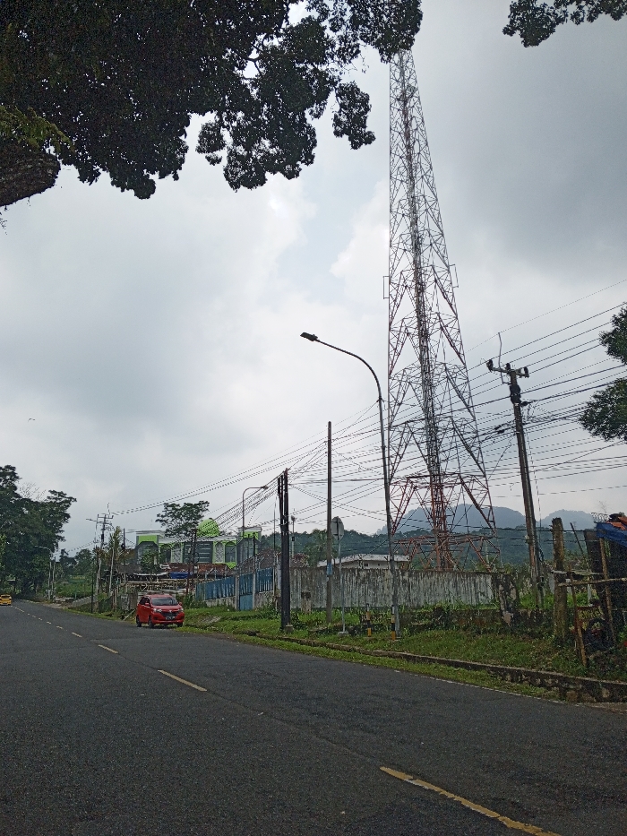 The image depicts a roadside scene identified as being in Multhan, India, under an overcast sky. A dark asphalt road with a faded yellow solid line marking is visible in the foreground, curving slightly to the left. On the left shoulder of the road, a red four-door passenger car is parked facing away from the viewer. On the right side of the road, a tall, red-and-white lattice communication tower stands prominently, extending high into the cloudy sky. Multiple utility poles with a dense network of black electrical and communication wires are positioned along the right side of the road, in front of the tower. A streetlight with a curved arm is attached to one of these poles. Behind the utility poles and wires, there is a fence or wall composed of various materials, including what appears to be corrugated metal and wood. Beyond this barrier, a multi-story building with a distinctive green-colored roof and light-colored walls is visible. Further in the background, a range of hills or mountains is present. To the far right, partially obscured by fencing and foliage, a figure dressed in dark clothing is discernible behind the fence. Dense tree foliage occupies the upper left portion of the image, and scattered trees and vegetation are present throughout the scene, particularly along the road and in the middle distance.