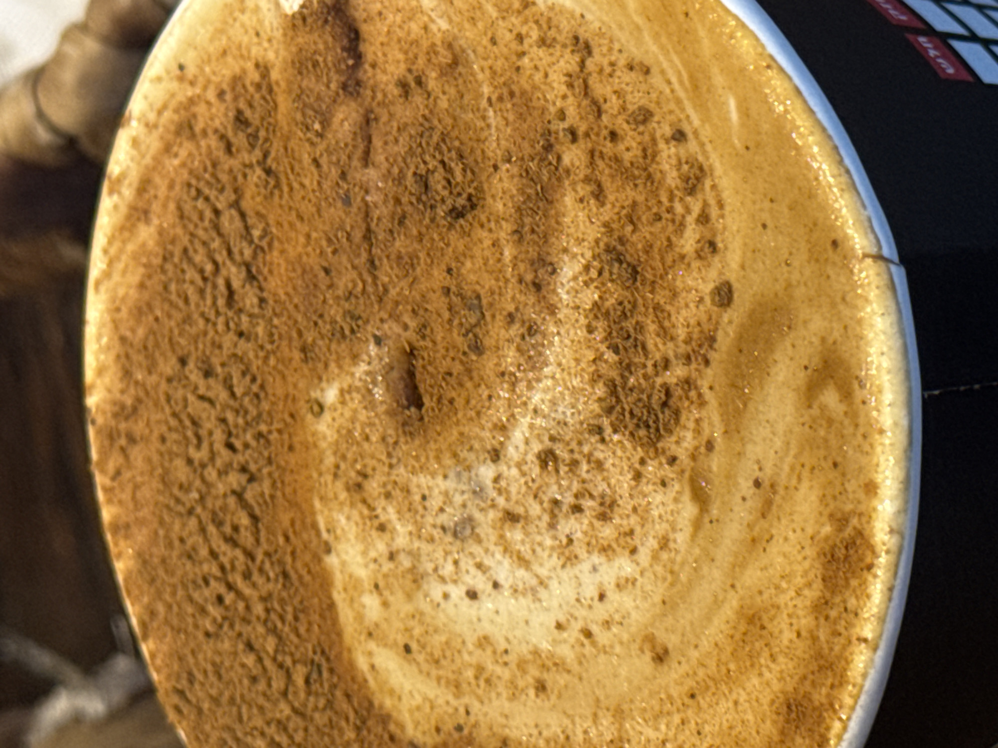 - "A close-up overhead shot of a cup of coffee, presumably a latte or cappuccino, topped with foamed milk and a generous dusting of brown spice, likely cinnamon or cocoa" by FM-GD1xd2, licensed under CC BY 4.0