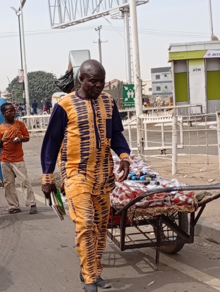 The scene in Gawuna, Nigeria, depicts an outdoor urban environment. In the foreground, an adult male with dark skin and a bald head walks towards the viewer's right. He wears a two-piece ensemble consisting of an orange and dark blue/purple patterned long-sleeved tunic and matching trousers, along with dark shoes. In his left hand, he holds several books or notebooks. Adjacent to him on his right, a metal two-wheeled handcart is laden with numerous clear plastic bags containing a reddish substance, possibly foodstuffs, topped with several small blue cylindrical objects. In the midground, to the left of the main subject, a younger male wearing an orange shirt and light trousers is partially visible, holding a light-colored cylindrical object and a white spherical object. The background includes a light-colored building housing an "Access" ATM, utility poles, a green sign with white figures, white metal barriers, and other multi-story buildings further in the distance under a hazy sky. The ground consists of an asphalt-like surface.