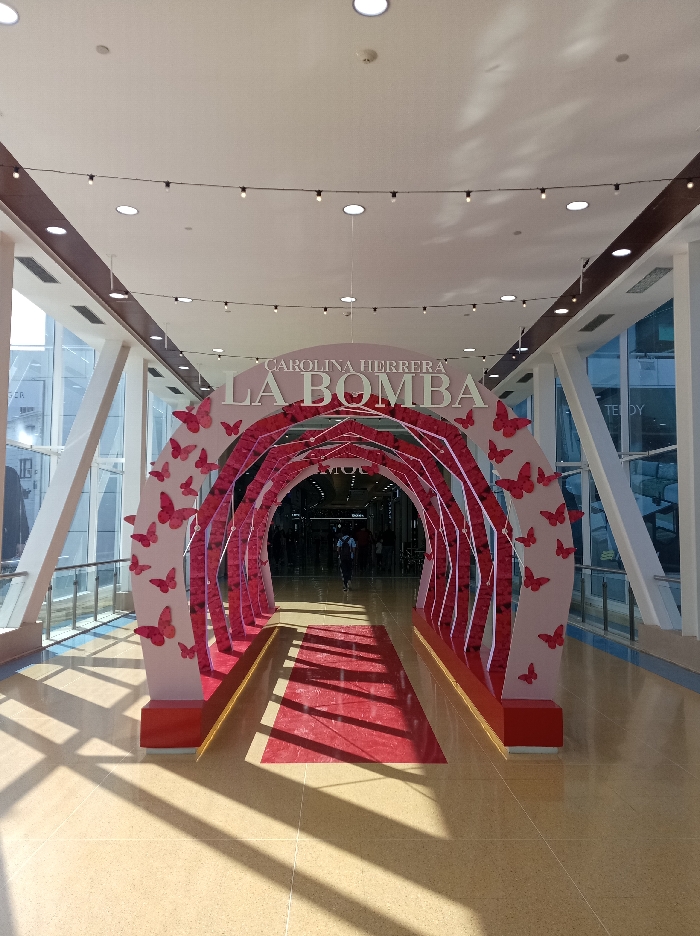 n indoor corridor or walkway within a commercial complex in Porlamar, Venezuela. A large, arched promotional display occupies the center of the frame, extending into the background. The arch's facade is light pink, decorated with numerous red butterfly cutouts of various sizes. The top of the arch features the text "CAROLINA HERRERA" and "LA BOMBA" in dark lettering. The interior of the arch consists of curved, vertical red panels, forming a tunnel. A red carpet or runner extends along the floor through the archway. The floor is a light beige, speckled material. Strong sunlight enters from the left through a large glass window wall, casting distinct shadows of white structural beams and a metal handrail onto the floor. Similar white structural supports are visible on the right side of the corridor, next to another windowed area. The white ceiling contains multiple recessed circular lights and two horizontal strings of smaller, suspended light bulbs. One individual is visible from behind, walking through the archway towards the darker area beyond it. They wear a dark shirt and a backpack. Other indistinct figures are present further in the background, past the arch.