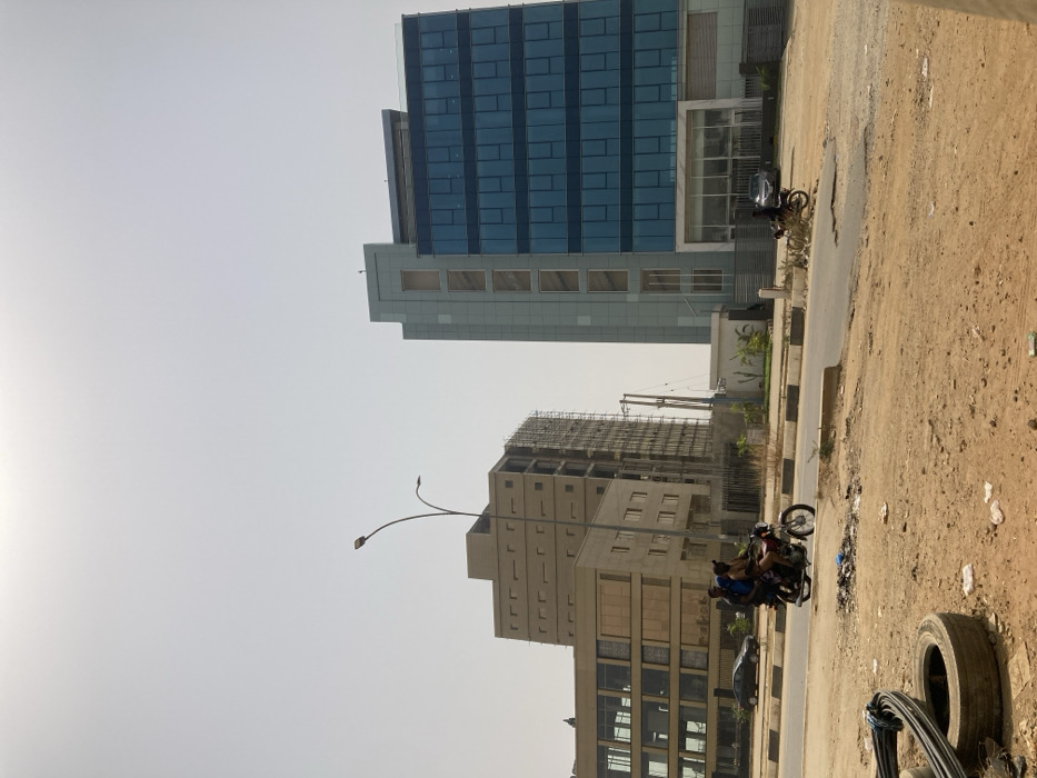 The image depicts an urban street scene in a developing area of Abuja, Nigeria, under a hazy, light grey sky. The foreground consists of dusty, unpaved ground with scattered debris, including stacked rebar and two discarded tires. An asphalt road with white and black striped markings runs horizontally across the midground. On this road, a motorcycle is traveling from right to left, carrying three individuals: a driver and two passengers. Further right, another motorcycle is visible, either parked or moving slowly, near the base of a building. A dark-colored car is also partially visible on the left side of the road. In the background, a cluster of multi-story buildings dominates the skyline. To the left, a light-brown, multi-level building appears to be under construction or recently completed, with scaffolding visible on its right side. Adjacent to it on the far left, another light-brown building structure is partially visible. Centrally, a tall, modern building with a light grey facade and numerous blue-tinted glass windows stands prominently, appearing completed or near completion. A tall street light pole with two curved arms extends upwards from the left-center of the frame. A utility pole with wires is visible between the central buildings. Some sparse green vegetation is present near the base of the modern blue-glass building. The scene reflects ongoing urban development within the city.
