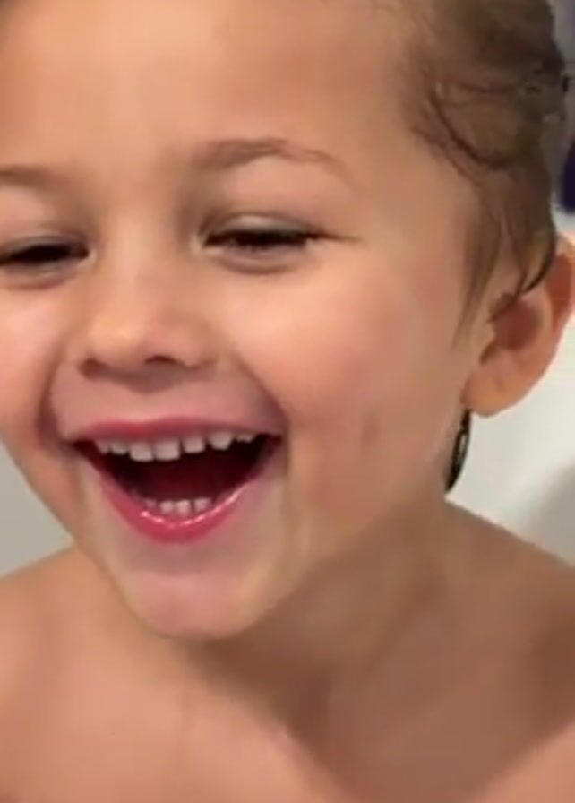 A young child, likely a toddler, is seen in a close-up shot, seemingly in a bathroom