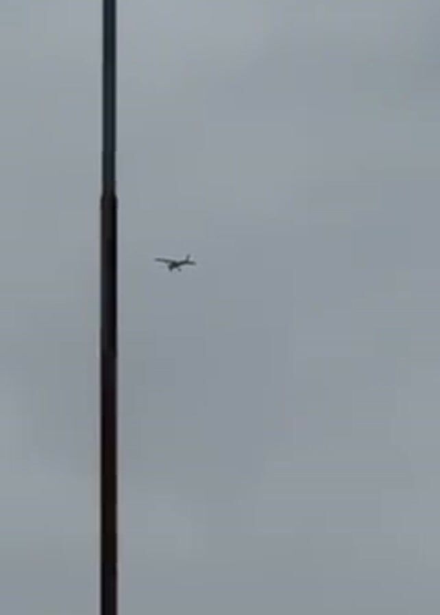 small plane in the sky under a cloudy sky. A light pole is in the foreground on the left.