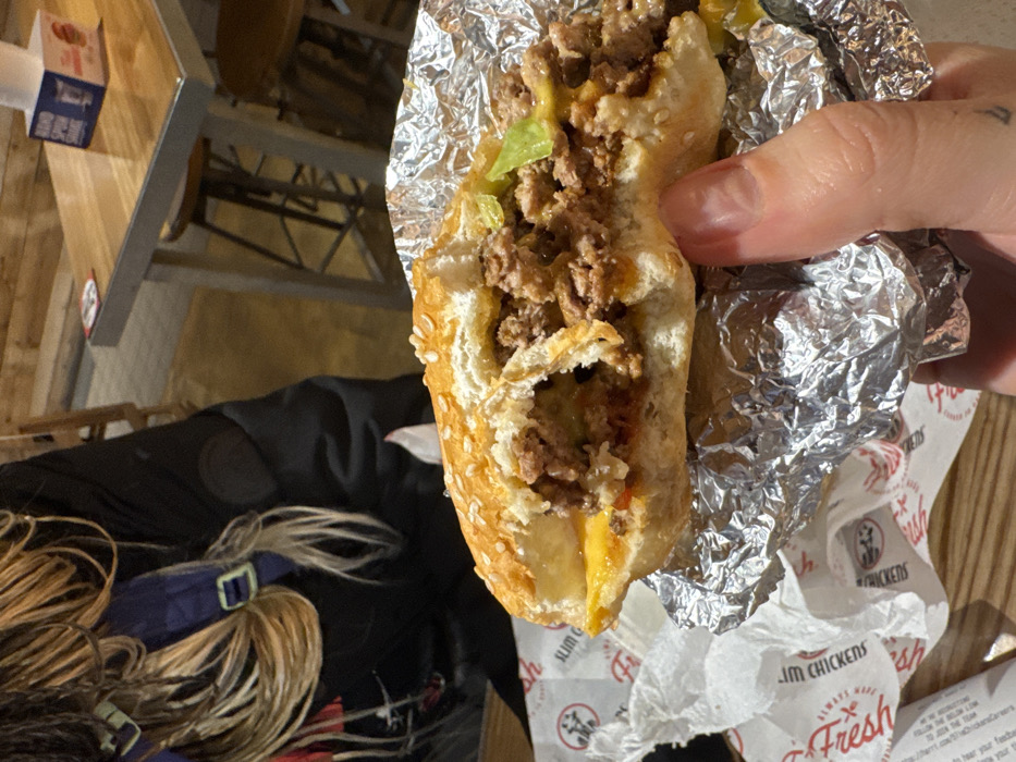 A half-eaten sesame seed bun sandwich is held in a hand. Ground meat and melted cheese fill the interior. A sliver of lettuce is also visible. Foil wrapping partially covers the sandwich. A Slim Chickens wrapper sits beneath the sandwich. Hair, clothing, and wooden furniture are in the background.