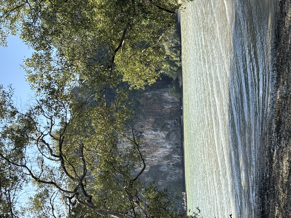 The scene depicts a coastal landscape in Ban Ao Nang, Thailand. The foreground features a dark, muddy intertidal zone with numerous visible vertical root structures, indicative of mangroves. This area transitions into a body of water, light green in coloration, with numerous horizontal ripples across its surface. Shadows from overhead foliage are cast onto the lower portion of the water. The middle and background are dominated by a massive, grey-white limestone cliff face with distinct vertical striations and scattered green vegetation. At the base of this cliff, along a narrow sandy or muddy shoreline, approximately 5-7 human figures are observed walking. To the far left, a cluster of at least three traditional longtail boats, distinguished by red and white elements, are moored near the water's edge at the foot of the cliff. Further right along the cliff base, dense green foliage is present. The upper portion of the image displays a clear, light blue sky, partially framed by the sun-dappled green leaves and branches of foreground trees.