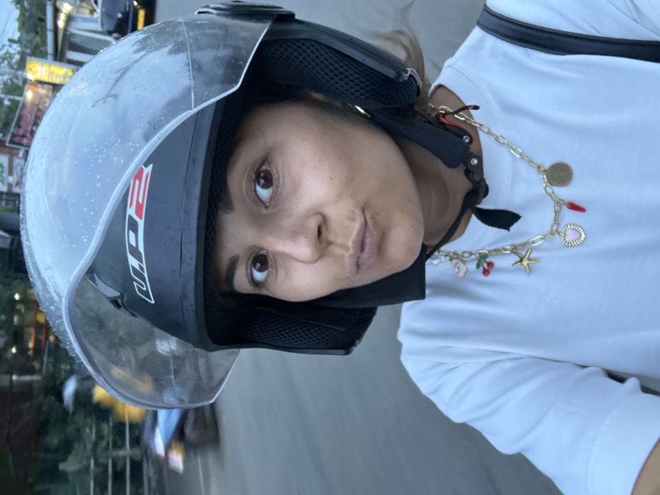 A female individual is depicted from the chest up, positioned as if on a moving vehicle, evidenced by the blurred background