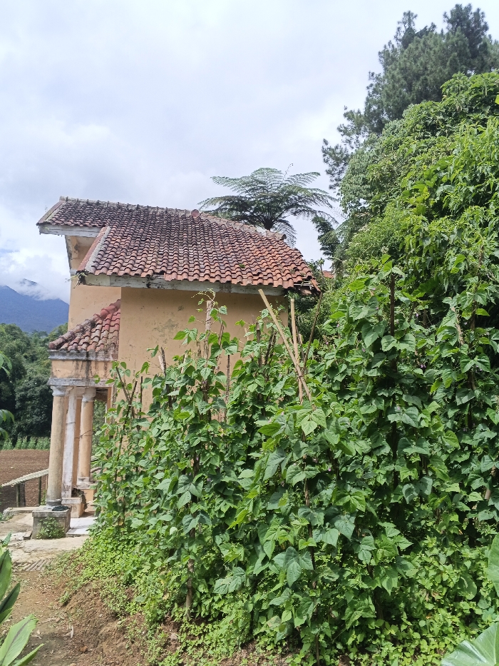 A rustic building with a tiled roof stands beside lush greenery. Tall green plants, supported by wooden poles, dominate the foreground, contrasting with the faded yellow walls and classical columns of the building. A fern tree and a pine tree rise in the background under a cloudy sky. The setting suggests a rural or agricultural environment, blending architecture with nature.