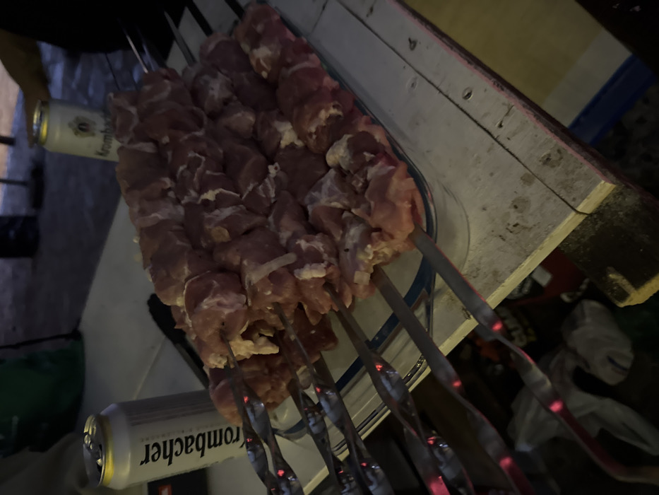 - "The image displays a clear glass dish holding numerous metal skewers laden with raw, cubed meat, possibly pork or similar light-colored protein, intermingled with lighter fragments that may be fat or onion" by FM-qIaSs1, licensed under CC BY 4.0