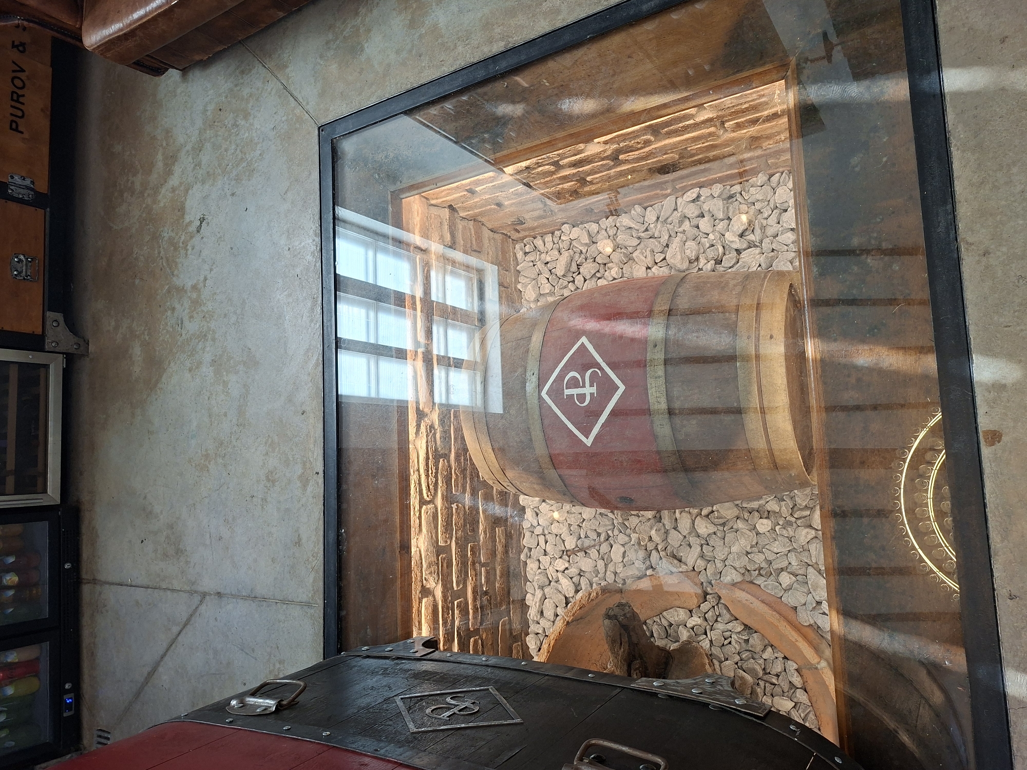 View of a barrel display under glass, possibly in a cellar or showroom in Asenovets, Bulgaria. The display features a wooden barrel with a red stripe and white emblem inside a glass enclosure with a black frame. The barrel rests on light gray gravel. Behind the barrel is a wall constructed from stacked bricks and an adjacent wall with a window, allowing natural light to enter the space. The ceiling of the display area is also bricked. Below the display is part of a dark wooden chest, possibly part of a larger unit including the wine refrigerator to the left. The chest has metal handles and a metal emblem on its top. To the left of the display is a brown leather trunk with the name "PUROV & S" on the side. A wine refrigerator is located beneath the trunk, which features bottles of various colors behind glass doors. The environment appears to be a commercial space, possibly a wine cellar or a showroom connected to a winery or a shop.