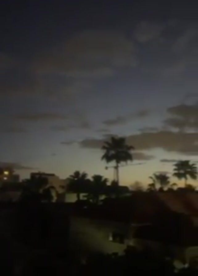 dusky twilight scene over a neighborhood. The sky transitions from a deep blue to a faint orange near the horizon, with patchy clouds scattered throughout. Silhouetted palm trees and other leafy trees stand against the sky, along with low-rise buildings featuring red-tiled roofs. The scene is shot from a slightly elevated perspective, likely from a balcony or upper floor. The neighborhood appears quiet and residential.