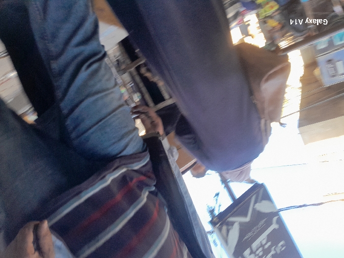 person wearing blue jeans and a striped shirt, possibly standing on a street or sidewalk. Adjacent to them, another person is visible, wearing a blue garment and carrying a tan-colored bag. The scene appears to be an urban setting, with a sign or advertisement in the foreground. Text "Galaxy A14" is visible in the top right corner. The camera angle is tilted.