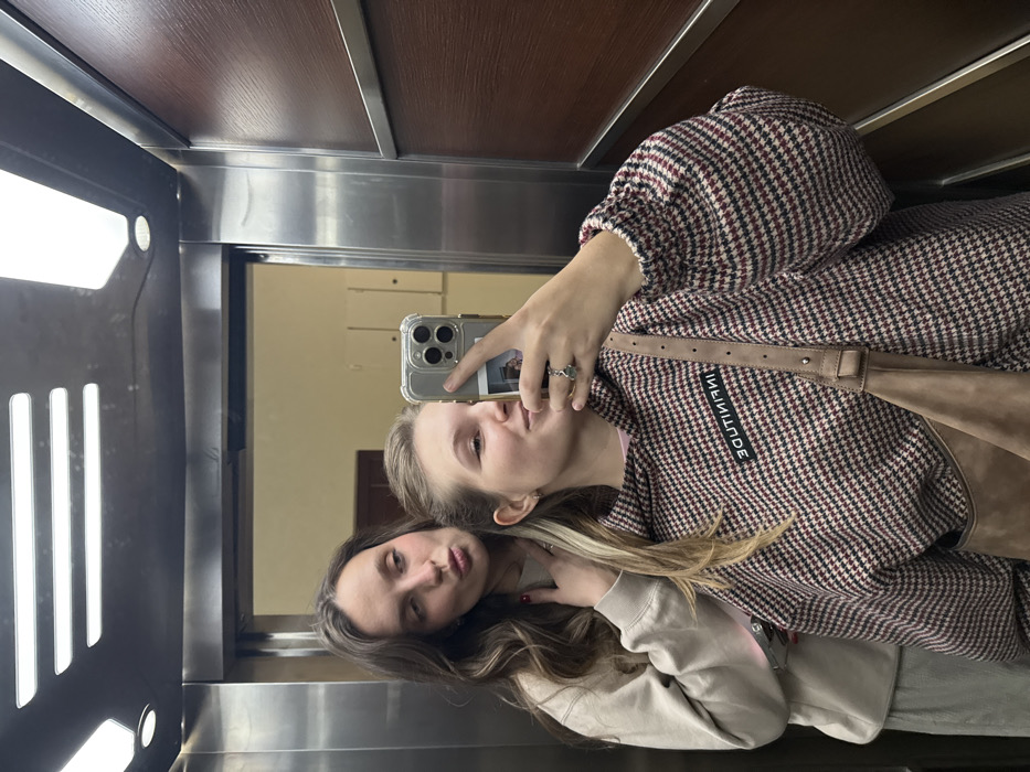 Two young women pose for a mirror selfie inside an elevator. One, with long brown hair, is closer to the mirror, looking at the camera. The other, with blonde hair, holds the phone, also looking at the camera, with a ring on her finger. She wears a houndstooth-patterned jacket with a shoulder bag and a label that reads "MHMITUDE". The elevator has stainless steel doors and a wooden panel at the top.