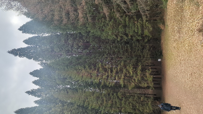 The image displays a wooded area in Bogoslov, Bulgaria, under an overcast sky. A dense stand of tall coniferous trees, predominantly evergreen, occupies the background and extends across the width of the frame. The trees vary in height, with several prominent, spire-like silhouettes reaching towards the top of the frame. In the foreground, a dirt path extends from the lower-left towards the center. One individual, seen from behind and slightly to the left, walks on this path, facing generally towards the right. The person is dressed in a dark-patterned jacket and dark trousers, and carries an object, possibly a piece of equipment or clothing, in their left hand. The ground adjacent to the path and in the central foreground is covered with a uniform layer of dry, light-brown fallen leaves. A small, square-shaped white sign on a dark post is visible in the middle ground, slightly to the right of the path, set against the backdrop of the trees.