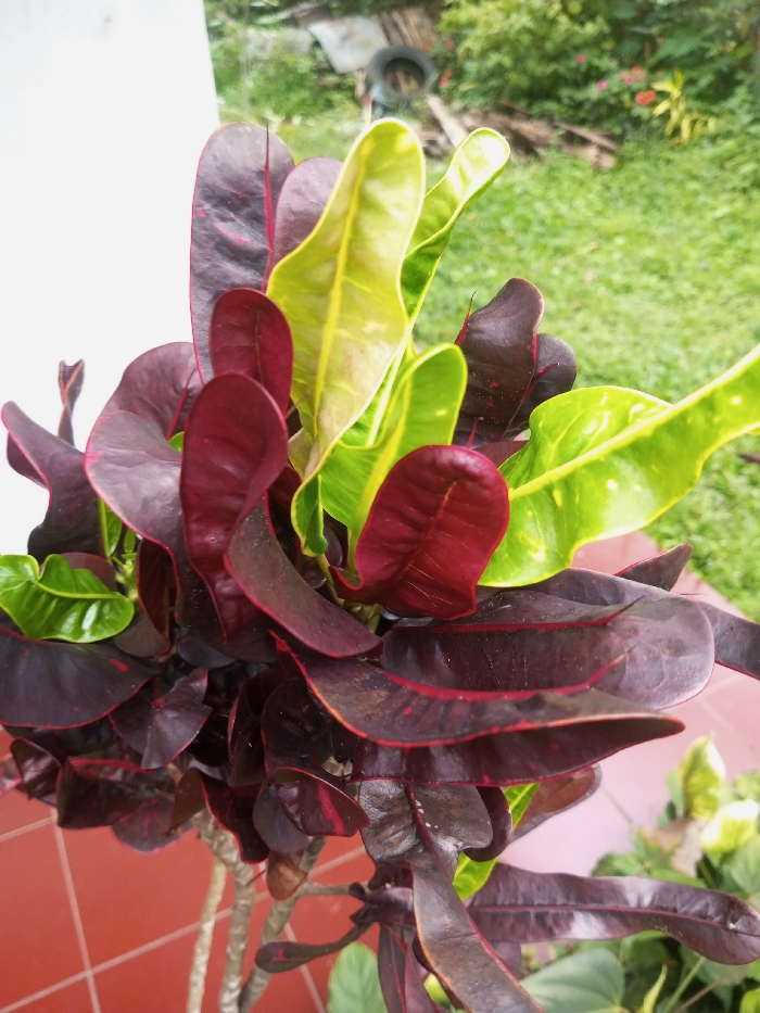 An upward-angled view in Ciherang, Indonesia, depicts a variegated Croton plant (Codiaeum variegatum) dominating the frame. The plant exhibits numerous broad, elliptical to lanceolate leaves. Most leaves are a deep maroon or dark red, some with lighter red or purple veining. Interspersed among these are several vibrant lime green to yellowish-green leaves, some showing variegation or patches of darker green. The plant's stems are visible at the lower portion. To the lower left, a surface composed of reddish-brown square tiles with white grout lines is partially visible. The background is a soft-focus, verdant landscape, primarily consisting of green grass and foliage. A portion of a white vertical structure is present on the far left. In the distant, blurred background, a dark, circular object rests on the ground amidst the greenery. No individuals or animals are present in the scene.