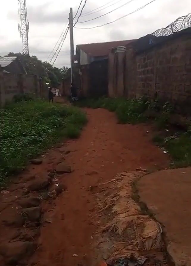 dirt road in what appears to be a residential or semi-rural area. The road is reddish-brown and uneven, with scattered rocks and debris. On either side of the road, there is vegetation and brick walls that border properties. Some of the walls are topped with barbed wire. Utility poles and wires run overhead. In the distance, a communications tower is visible. Further down the road, three people are walking away from the camera. The sky is overcast.