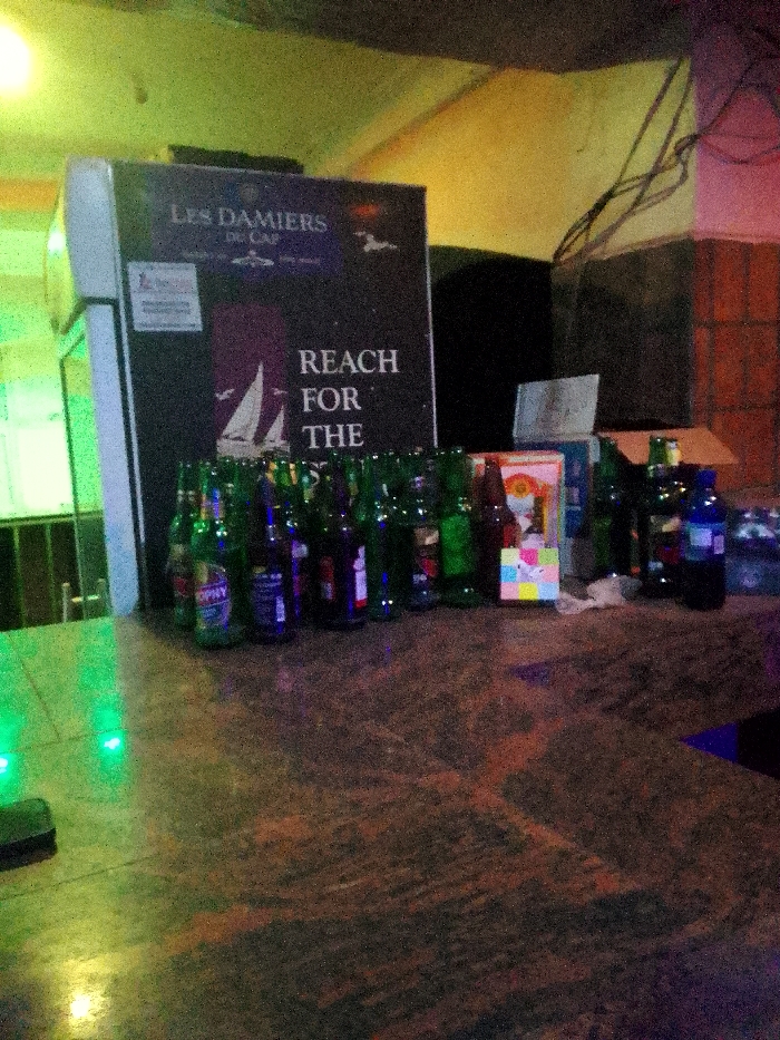A dimly lit bar area features a shelf stocked with various bottles of beer and other drinks