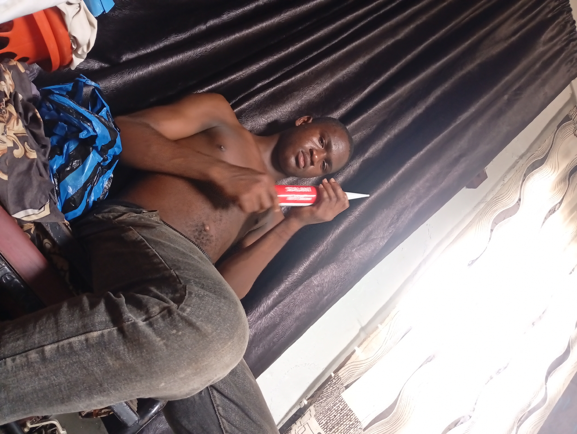 An individual is recumbent on a surface covered with a dark, shiny fabric. The person, wearing jeans, holds a red and white caulk tube. The environment includes a window with white curtains, some bags, and what looks like a bucket. The specific location is presumed to be Owerri, Nigeria.