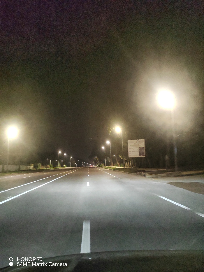 A nighttime view from inside a vehicle, looking down a straight, illuminated road. Streetlights line both sides of the road, their glow reflecting off the asphalt. White lane markings are visible. A sign is prominent on the right. The sky is dark. A portion of the vehicle's dashboard is visible at the bottom. The bottom left corner of the image features the device branding "HONOR 70 54MP Matrix Camera."