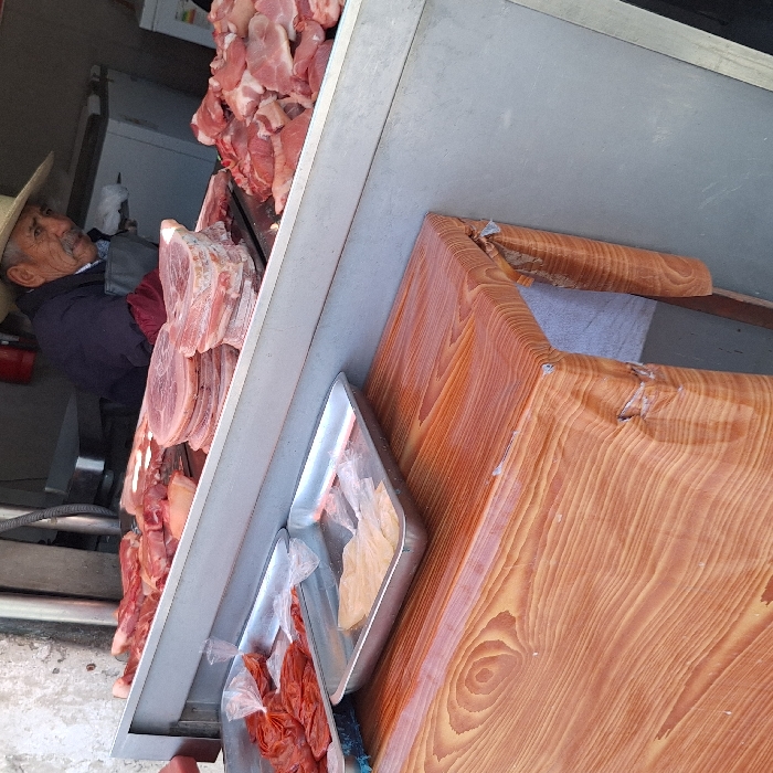 An elderly man wearing a straw hat stands beside a meat display. Various cuts of raw pork hang, and trays of different meats are visible. A wooden-patterned countertop is on the right. The scene appears to be a small butcher shop or meat stall. The background is slightly out of focus, suggesting a tight space.