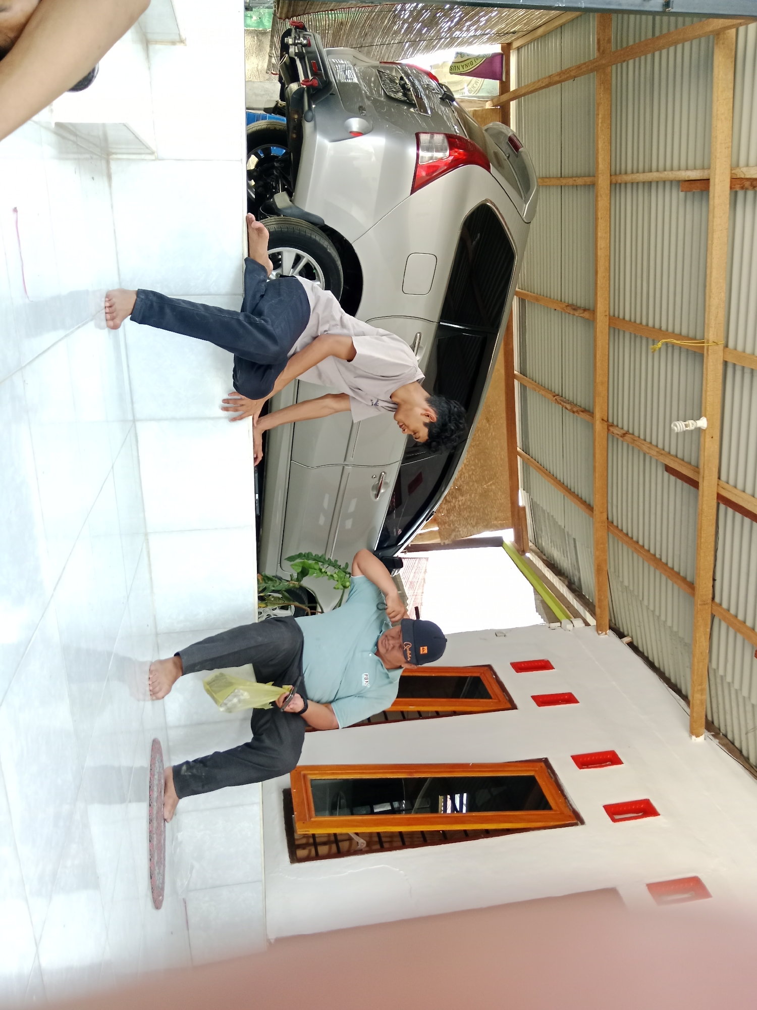 two barefoot men in what appears to be a driveway in Gampongjawa, Indonesia. One man, wearing dark pants and a light-colored shirt, has one hand on the side of a silver SUV parked in the driveway. The other man, wearing dark pants, a light blue shirt, and a baseball cap, is holding a plastic bag in one hand and what appears to be a pair of scissors in the other. The driveway is tiled, and the house has windows with wooden frames. The car is parked next to a structure with corrugated metal walls and wooden supports.