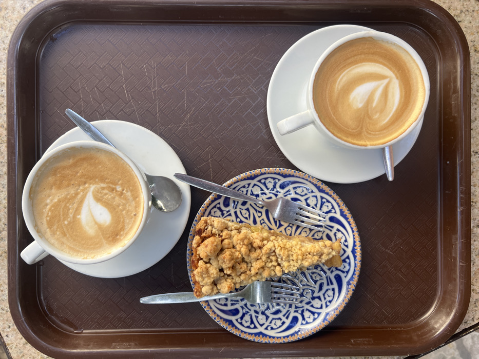 - "The image depicts an overhead view of a brown textured serving tray containing two cups of coffee and a slice of crumble pie" by FM-Bufrv1, licensed under CC BY 4.0