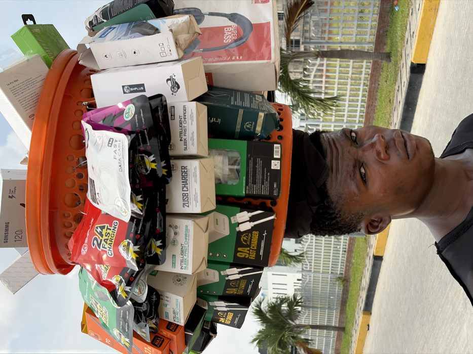 A young dark-skinned male individual is photographed in Moba, Nigeria, balancing a large, orange, perforated plastic basket on his head. The basket contains an array of packaged mobile phone accessories, including items labeled '2A FAST CHARGING' cables, 'FAST DATA CABLE' products, 'INTELLIGENT SLEEK FAST CHARGER' units, '2USB CHARGER' boxes, '9A FAST CHARGER' kits, and 'SUPER BASS' headphones. The individual wears a dark shirt and looks directly forward. The background features a paved street with a yellow-painted curb, a white metal fence, green palm trees, and indistinct light-colored buildings under a pale blue sky.