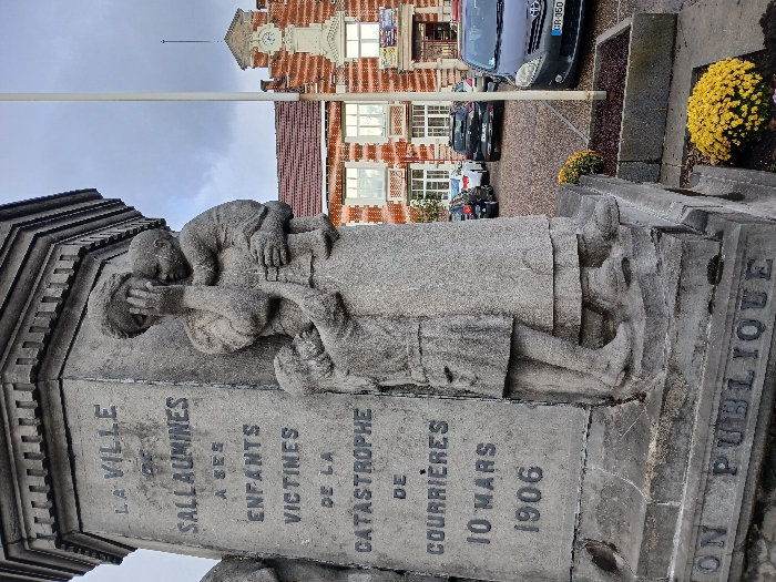 - "A weathered grey stone monument stands prominently in Sallaumines, France, bearing the inscription "LA VILLE DE SALLAUMINES A SES ENFANTS VICTIMES DE LA CATASTROPHE DE COURRIÈRES 10 MARS 1906" on its hexagonal column, with "ON PUBLIQUE" visible on its base" by FM-4kXs22, licensed under CC BY 4.0