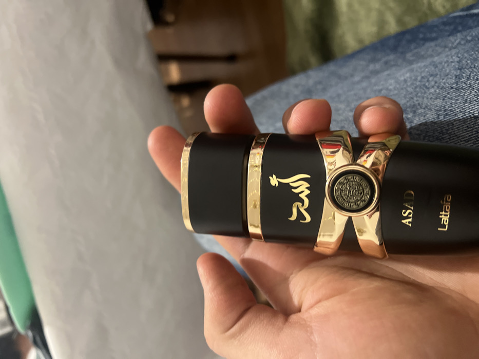 The image displays a close-up, first-person perspective of a hand holding a black and gold cylindrical perfume bottle. The human hand, appearing to be a right hand, grips the bottle from the left side, with visible thumb and fingers. The perfume bottle features gold Arabic script for "أسد" (Asad) near the top, followed by a design of two horizontal gold bands crossing over a central, circular dark medallion with intricate patterns. Below this, the English word "ASAD" is printed in gold, and "Lattafa" is visible further down, also in gold. The background is out of focus; the upper portion reveals a light-colored surface, possibly a white tablecloth or fabric, with a blurred light green object to the far left. The lower right portion of the background shows blue fabric, consistent with denim jeans, likely worn by the individual holding the bottle. Darker, blurred elements, possibly furniture, are also visible in the background. The scene depicts an indoor environment. There are no visual elements within the image to identify the specific location as Strasbourg, France.