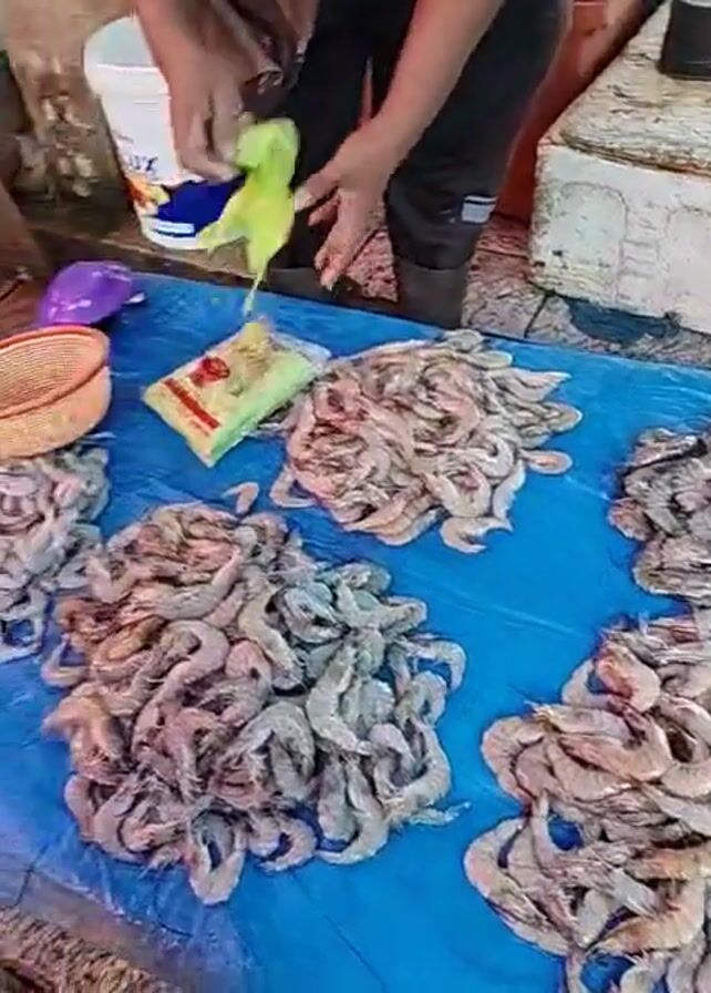 fish market. There are two tables displaying seafood. One table has piles of shrimp on a blue tarp. The other table is covered with banana leaves and displays various types of fish. A man is sitting on a stool behind the table covered with fish, preparing them. Another person is visible briefly at the left side of the frame, holding a phone and wearing a black and white patterned top.