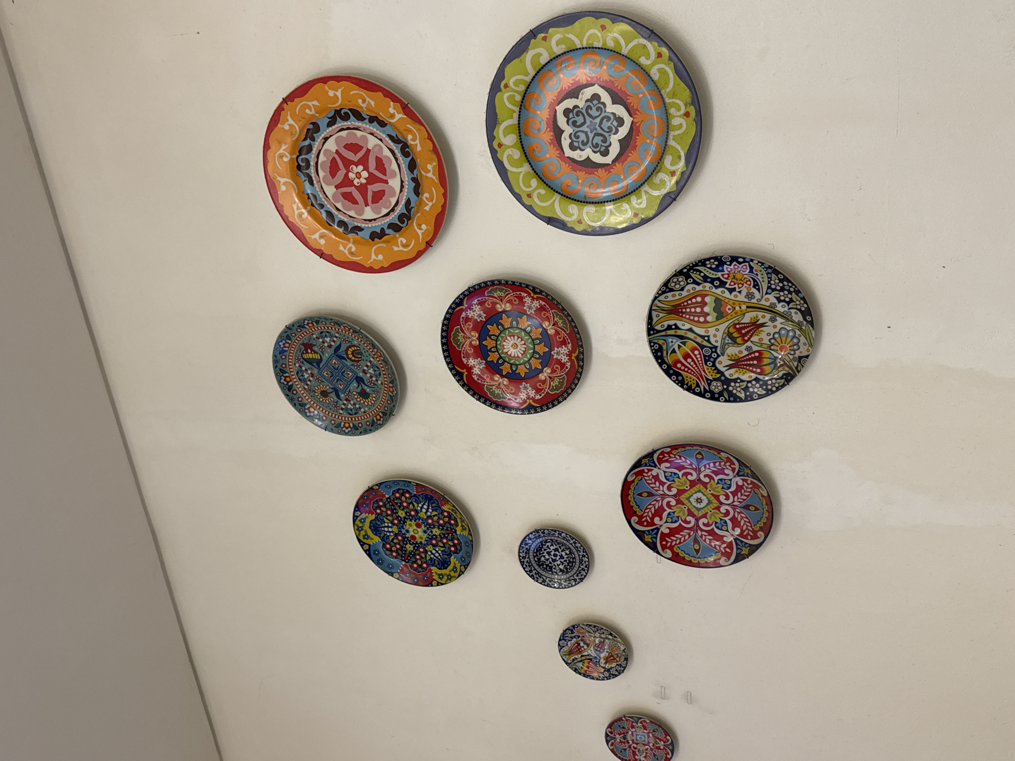 The scene depicts a light-colored interior wall, likely within a residence or establishment in Bekasi, Indonesia. Nine circular decorative plates, varying in diameter, are affixed to the wall surface. The plates exhibit diverse, colorful, and intricate patterns, predominantly floral and geometric motifs, utilizing palettes of blue, red, orange, green, yellow, and white. They are arranged in a staggered, non-linear pattern, with larger plates generally positioned towards the upper right and progressively smaller ones towards the lower left. Two small, white, hook-like mounting points are visible on the wall in the lower-left section, below the smallest plate. The wall appears clean, with minor surface variations. No individuals or active events are present in the depicted environment.