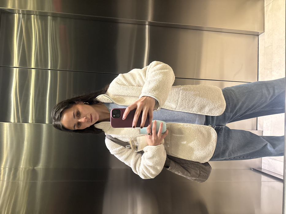 A woman in light-wash jeans and a cream-colored jacket with a gray shoulder bag takes a selfie in what appears to be an elevator