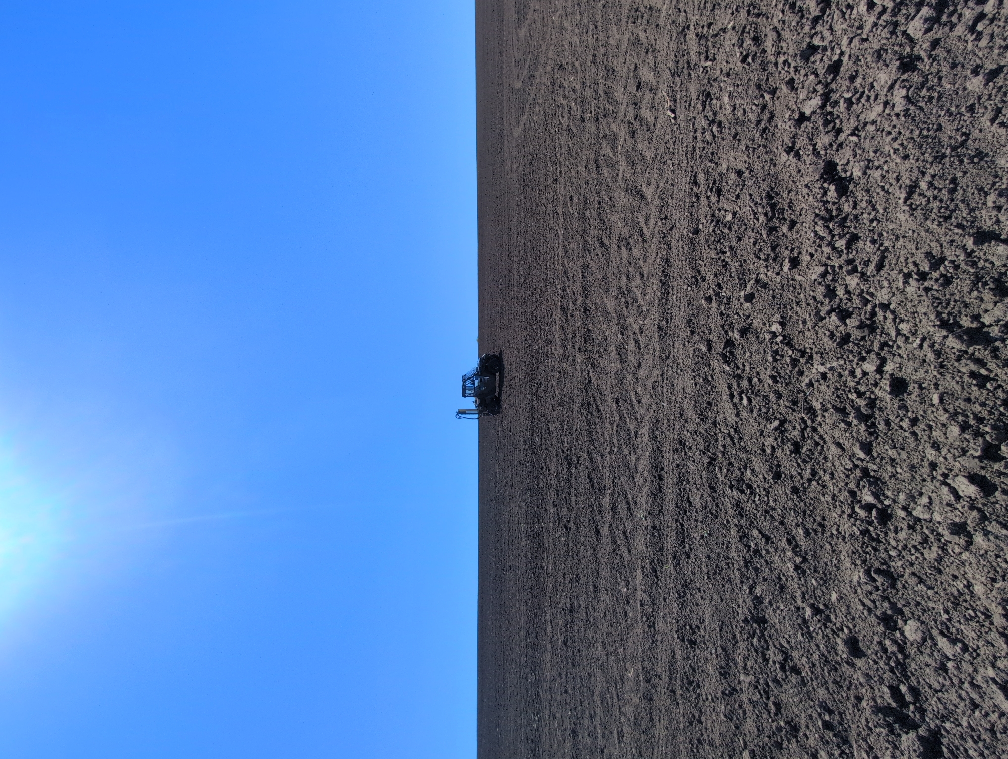The image depicts a plowed field under a clear blue sky