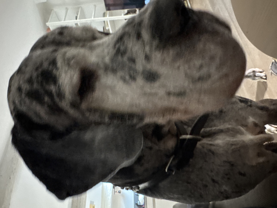 - "The image depicts a large domestic canine, identifiable as a Great Dane with a blue merle coat pattern, positioned centrally in the foreground" by FM-CIOZn2, licensed under CC BY 4.0