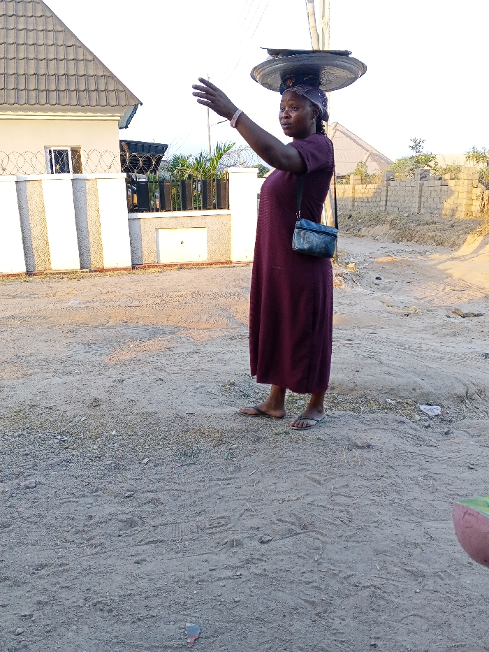An adult female stands on an unpaved dirt road in Adonkolo, Nigeria. She is positioned slightly off-center to the right, facing partly right with her right arm extended forward, palm open. A large, round, metallic tray is balanced on her head. She wears a full-length, maroon dress, a dark patterned headwrap, and dark flip-flop sandals. A small, dark crossbody bag is worn over her left shoulder, and a light-colored bracelet is on her right wrist. The background on the left features a modern, light-colored single-story house with a grey tiled roof and a white window, fronted by a security fence topped with barbed wire. To the right, a weathered concrete block wall is visible. A utility pole with wires stands behind her. The ground is light brown dirt with scattered small debris and faint surface tracks. A partial, indistinct pinkish-red object is visible in the lower right corner. The scene is illuminated by natural daylight.