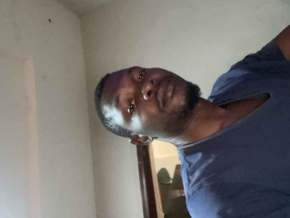 A man with dark skin and a beard poses for a selfie. He wears a dark blue t-shirt. The background is a beige-colored wall with a dark spot and a door slightly ajar, revealing a glimpse of a room with some objects. The man's head is slightly tilted, with his eyes looking directly at the camera. He has short black hair.