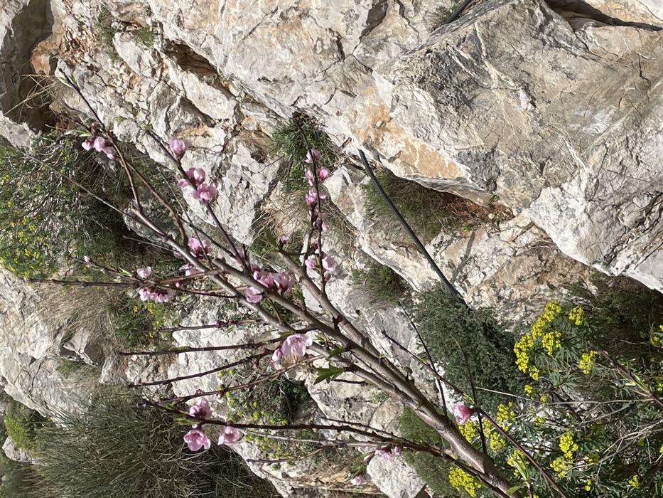 The scene depicts a rocky hillside in Perazića Do, Montenegro, under direct daylight. A deciduous tree or shrub, characterized by numerous pink blossoms and emergent small green leaves on slender brown branches, occupies the central-left portion of the frame. The background consists of a steep incline covered in large, irregularly shaped, light-grey and beige rocks, exhibiting varied textures and fracture patterns. Interspersed among the rocks are patches of green foliage, including a prominent cluster of yellow-flowering plants in the lower-left, and some drier, light-brown grasses. A black, flexible pipe or hose is visible, extending diagonally from the mid-right down towards the lower-center, partially obscured by rocks and low-lying vegetation. No individuals, animals, or specific actions are observed within the frame.