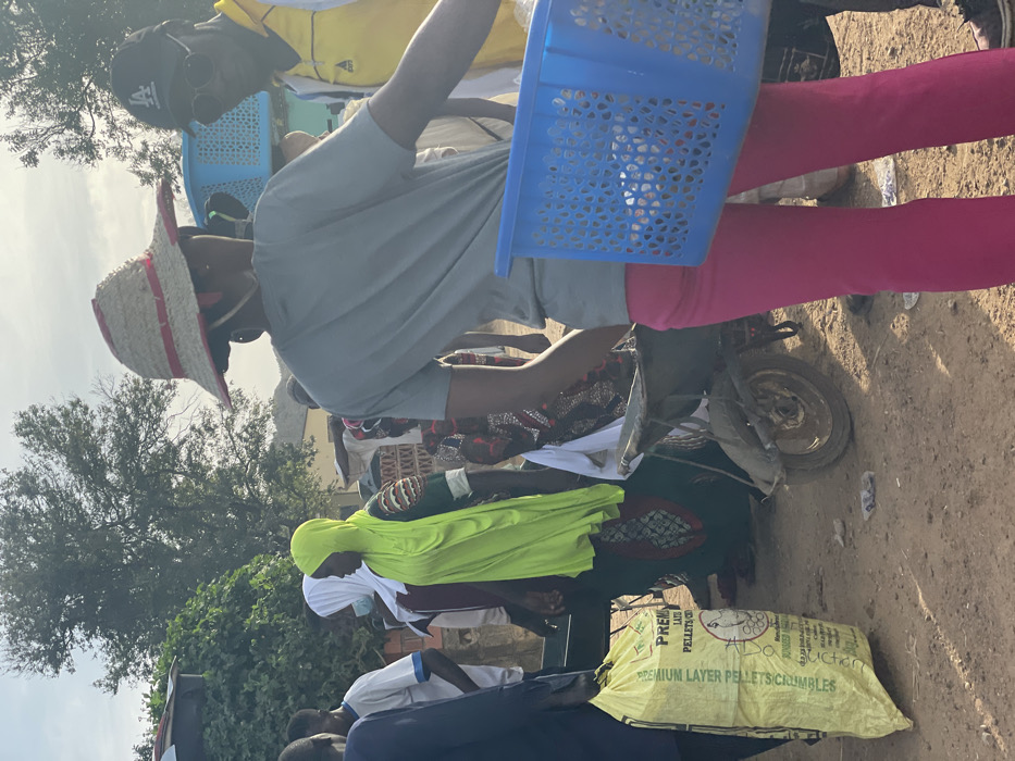 group of people in a bustling outdoor scene, possibly a market. A person in pink leggings and a grey shirt is holding a blue basket. Nearby, a woman is wearing a green hijab and a white headscarf. A yellow bag with the words "PREMIUM LAYER PELLETS/CRUMBLES" is visible on the ground. A motorcycle is parked near the bag. Trees and buildings are faintly visible in the background. Other people are standing around, creating a crowded and lively atmosphere.