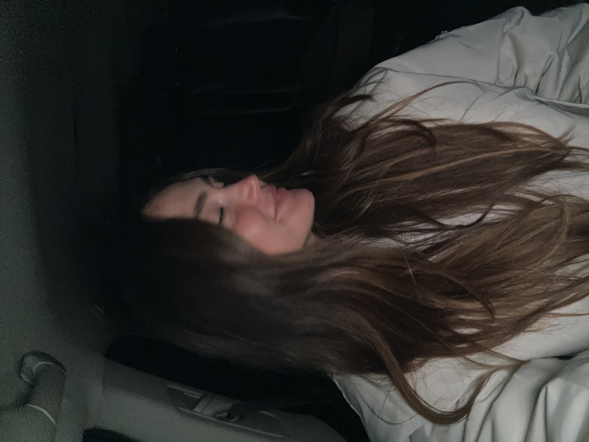 This image displays the interior of a vehicle during nighttime or low-light conditions. A single female individual occupies the foreground, positioned in profile facing towards the right side of the frame. She possesses long, dark brown hair with lighter auburn highlights, draped over her shoulders and upper torso. Her eyes are closed, and she exhibits a subtle smile or smirk. She is attired in a light-colored (likely off-white or light grey) zippered jacket, appearing to be padded or insulated. The background is predominantly dark and out of focus, consistent with a vehicle's interior. A ceiling-mounted grab handle is discernible in the upper left corner. The specific location within the city of Surgut, Russia, cannot be visually identified from the content of this image alone.