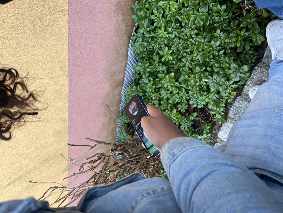 The image depicts a high-angle view of an outdoor scene in Meistratzheim, France. A person, partially visible, wears a light blue denim jacket and light blue jeans with white sneakers. The right hand of this individual holds a black smartphone, with the thumb positioned on its illuminated screen. The phone screen displays text, including "Your position," "100m," "977m," "Full Pepper," "1.7km," "5:26," and "2.8km," alongside a circular profile image at the top right. Above the phone, a mass of dark, curly hair is visible. The background consists of a two-toned wall: the upper section is light yellow/beige and textured, while the lower section is dusty pink and textured. At the base of the wall, a dark gray grid-like structure is present. Adjacent to this, a dense patch of dark green, glossy groundcover with distinct leaves occupies the mid-ground. To the left of the groundcover, a leafless, dormant shrub with thin, dark branches is visible. A narrow strip of gray cobblestone or paving separates the groundcover from the person's feet.